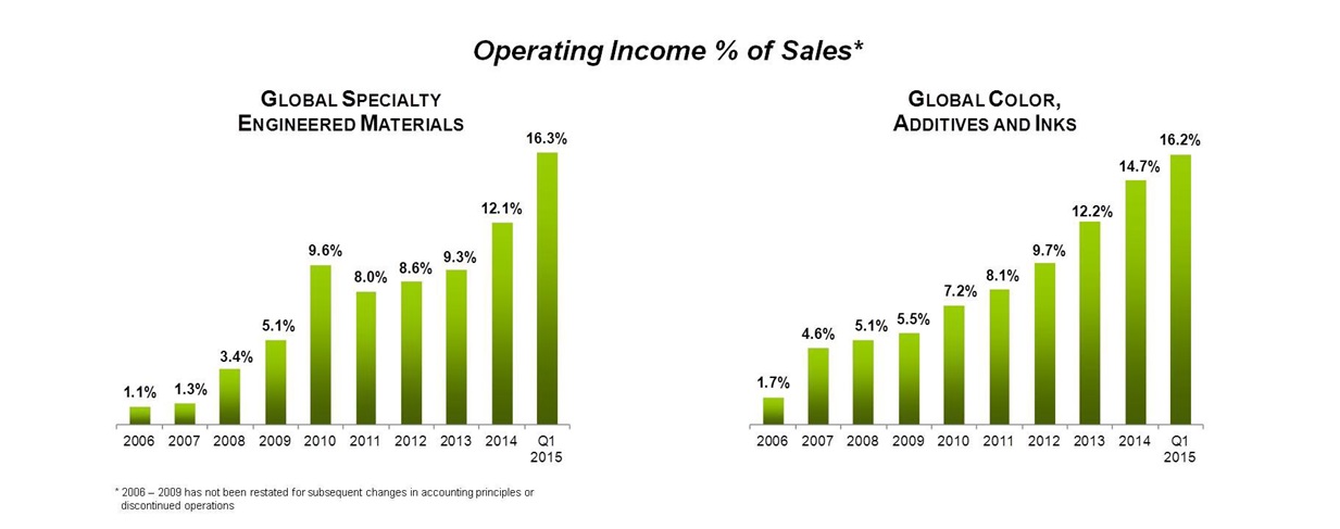 "Our first quarter results highlight the power of specialization as Color and Engineered Materials delivered double digit operating income growth in a very challenging environment.  This would not have been possible had we not transitioned these businesses to specialty," said Mr. Patterson.